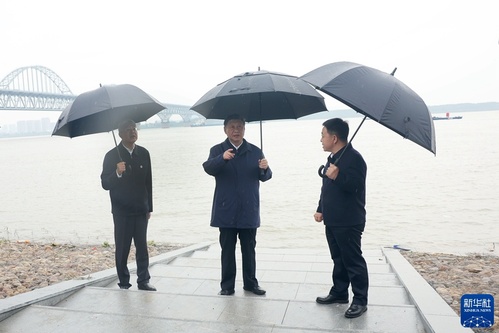 10月10日至13日,中共中央总书记、国家主席、中央军委主席习近平在江西考察。这是10日下午,习近平在长江国家文化公园九江城区段考察时,冒雨沿江堤步行察看沿岸风貌。新华社记者 谢环驰 摄