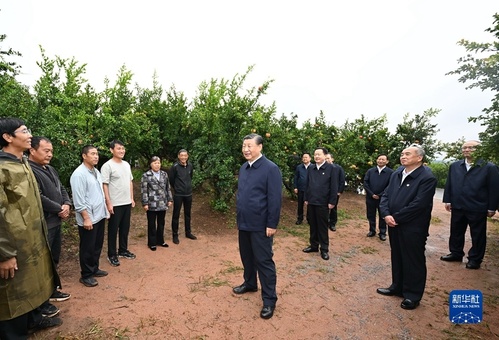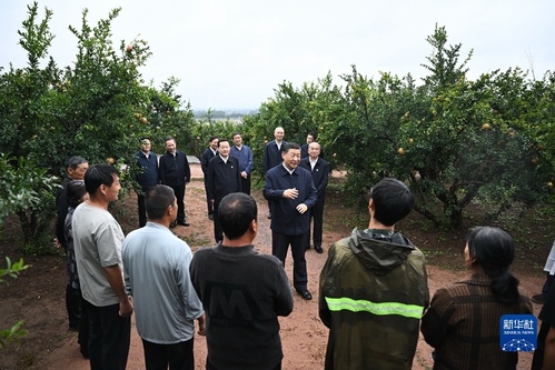 9月24日,中共中央总书记、国家主席、中央军委主席习近平在浙江考察结束返京途中,来到山东省枣庄市考察。这是习近平在位于峄城区的冠世榴园石榴种植园了解石榴产业发展情况。新华社记者 燕雁 摄