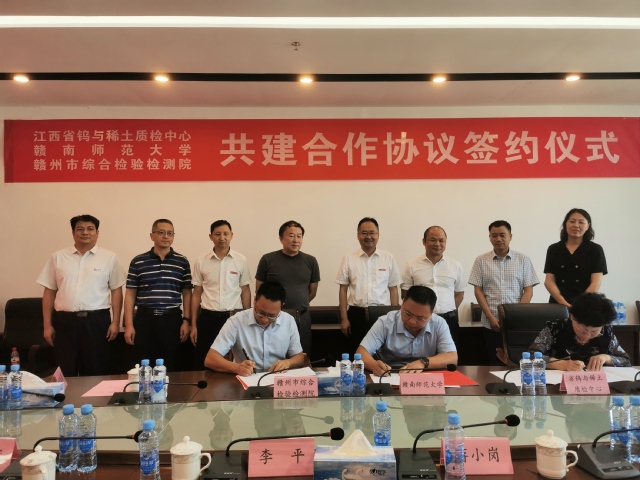 9月29日,江西省钨与稀土质检中心、赣南师范大学、赣州市综合检验检测院共建合作签约仪式在赣县区(赣州高新区)举行。学校党委委员、副校长吴磊,赣州高新技术产业开发区管理委员会党工委委员、副主任廖绍清,江西省钨与稀土产品质量监督检验中心主任、江西省钨与稀土研究院院长蒋小岗,赣州市综合检验检测院院长刘汉泉等出席。学校发展规划处、科研处、化学化工学院等单位负责同志参加。