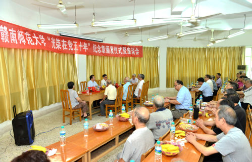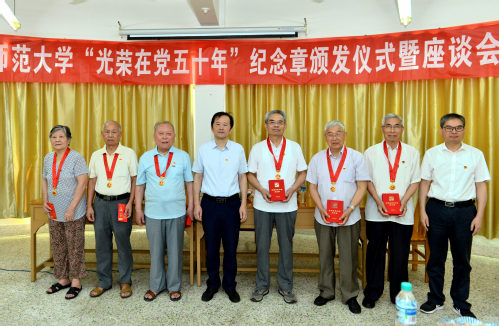 6月28日,学校举行“光荣在党50年”纪念章颁发仪式暨“庆七一”老同志座谈会。学校党委副书记、校长朱小理出席并讲话,党委委员、副校长邱小云主持仪式。何明、刘瑞桂、郑翠姣、李贤海、曾昭贵、谢能武等六名“光荣在党50年”老党员,校党委委员、组织部部长肖笃森,党委委员、宣传部部长左群,党委(校长)办公室、离退休工作处等部门负责同志,离退休党委各党支部、各协会有关同志参加。