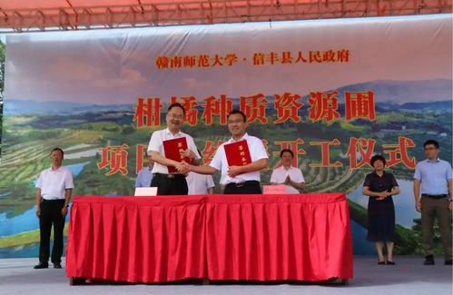 7月1日,我校国家脐橙工程技术研究中心柑橘种质资源圃建设项目签约暨开工仪式在信丰县安西镇桐梓村(原信丰脐橙场一分场)举行。学校党委副书记、校长朱小理,党委委员、副校长吴磊,副厅级领导吴剑波,信丰县委副书记、县长张琳等领导出席。赣州市农业农村局、果业发展中心负责同志,学校发展规划处(国内合作促进中心)、国家脐橙工程技术研究中心、生命科学学院负责同志,信丰县相关县领导、各乡(镇)长、县直各有关部门负责同志,项目有关单位及属地乡镇干部近200人参加。