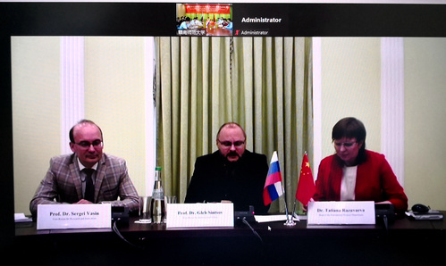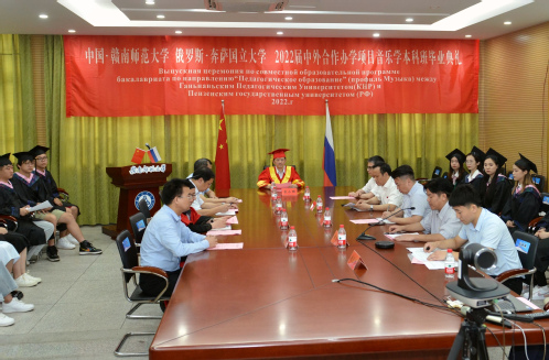 6月8日下午,我校与俄罗斯奔萨国立大学2022届中外合作办学项目毕业生毕业典礼在音乐学院举行,校长朱小理,副校长邱小云,俄罗斯奔萨国立大学副校长辛佐夫·格列布、副校长谢尔盖·米哈伊洛维奇出席,学校有关职能部门负责人、俄罗斯奔萨国立大学有关领导教师代表,音乐学院党政负责同志、教师代表以及音乐学(中外合作办学)2022届在校毕业生参加。毕业典礼采取“现场+线上”的方式举行,俄方学校代表通过线上会议的形式参加。