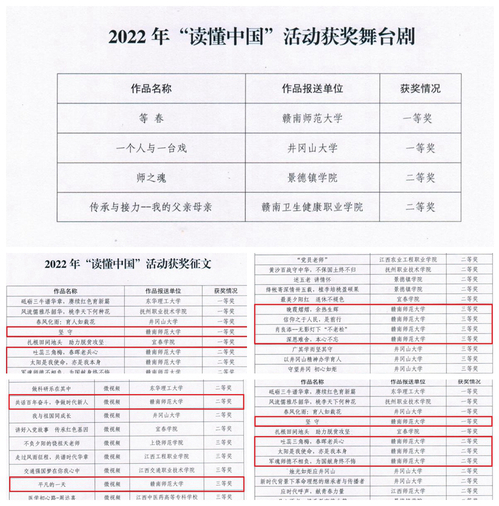 日前,江西省教育厅关心下一代工作委员会公布了2022年度全省高校“读懂中国”主题活动评审结果。我校共有11个项目获奖,其中一等奖2项、二等奖4项、三等奖5项,学校关工委获评优秀组织奖。