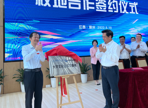 签约仪式上,朱小理和何善锦共同为大学生就业实习基地揭牌。外国语学院院长何明清与赣州国际陆港管委会谢小龙代表双方签订合作协议。