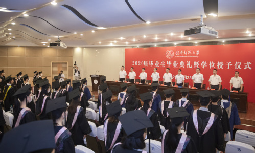 四年砥砺硕果累,扬帆奋进正当时。6月23日下午,学校2020届毕业生毕业典礼暨学位授予仪式在图书馆科报厅举行。学校领导范小林、卢超、胡龙华、刘民、邱小云、吴剑波、吴磊、罗序中、于保春出席,有关职能部门负责人、各教学学院党政负责同志、教师代表、学生家长代表及100名毕业生代表参加。毕业典礼由副校长罗序中主持。