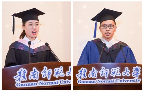 马克思主义学院2020届思想政治教育专业本科生郑美龄、数学与计算机科学学院2020届数学专业研究生李声豪,分别代表本科毕业生和毕业研究生发言,与全体毕业生一同回忆大学生活的点滴、成长和收获,表达对母校的惜别之情和对老师的感激之情,并向母校承诺,他们一定会谨记老师的教诲,在人生道路上做一个品德高尚、信念坚定、坚持奋斗的人,用努力回报社会、回报母校。
