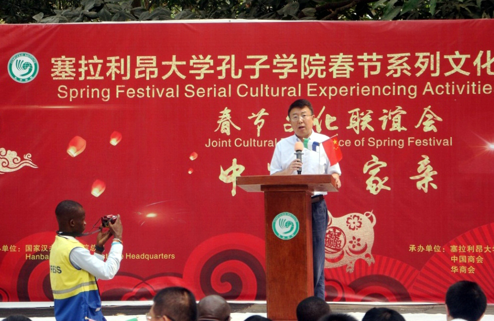 当地时间1月29日,塞拉利昂大学孔子学院太极园张灯结彩、喜气洋洋,“中塞一家亲,喜迎新春”春节系列文化体验活动在此拉开序幕。中国驻塞拉利昂大使吴鹏出席活动并致辞,塞拉利昂大学领导,驻塞中国商会、华商会、中资企业代表,孔子学院各教学点及师生共五百余人参加活动。