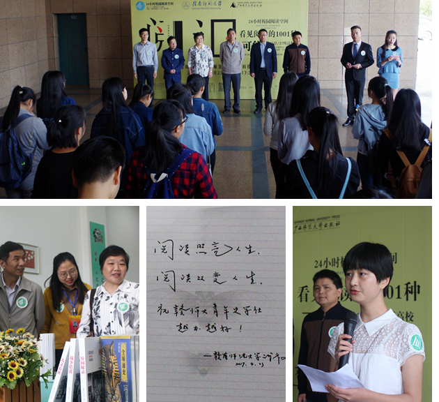 “阅读照亮人生,阅读改变人生”“知识改变命运,读万卷书行万里路”“读书改变人生,读书创造人生”……活动启动仪式后,校党委委员、组织部长谢庐明,历史文化与旅游学院院长林晓平、党委副书记孙胤来到读书分享会现场,与活动参与者一起书写读书感言,希望青年学生深刻学习领悟贯彻李克强总理“世界读书日虽然只有一天,但我们应该天天读书”的讲话精神,培养良好的阅读习惯。