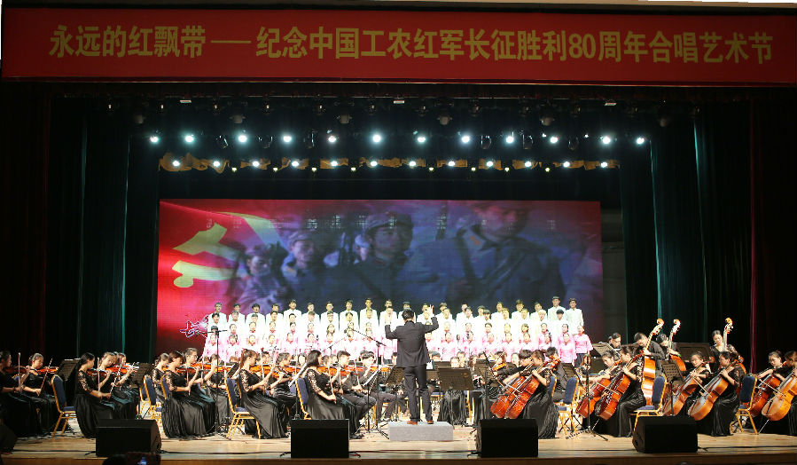 长征精神永不忘,音乐学子踏征程。10月21日晚,由江西省委宣传部、省文化厅主办,中共赣州市委宣传部、中共于都县委、于都县人民政府承办的“永远的红飘带”――纪念红军长征胜利80周年长征之歌合唱艺术节,在于都县文化艺术中心拉开帷幕。