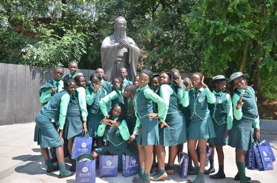 塞拉利昂首个来华夏令营在学校孔子雕像前合影留念