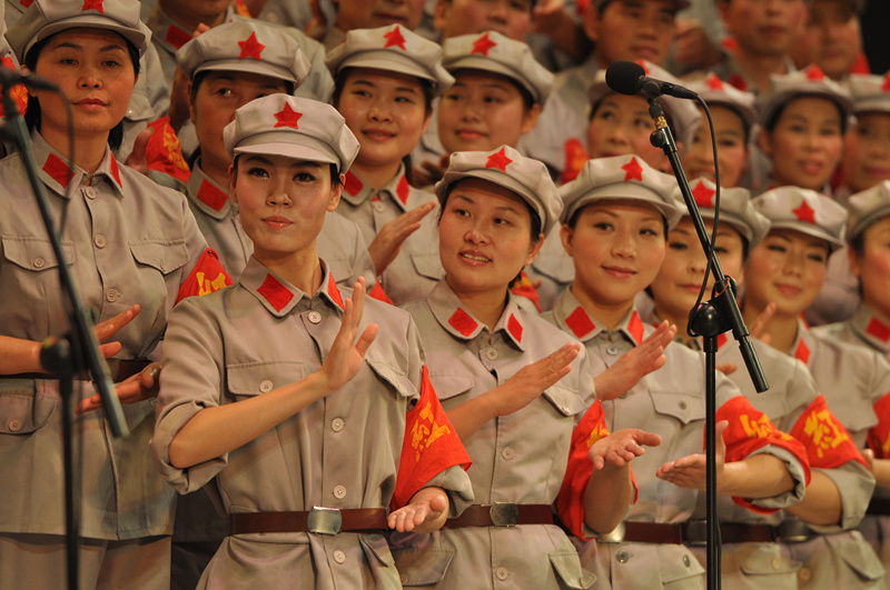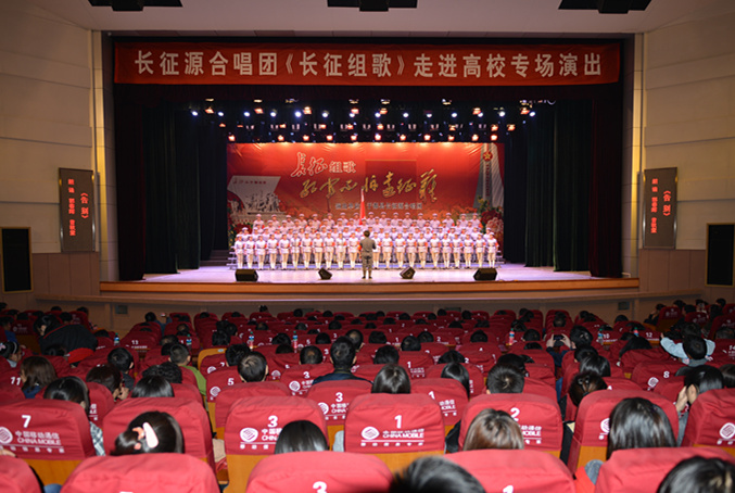 在全国上下认真学习贯彻党的十八届三中全会精神以及纪念毛泽东同志诞辰120周年之际, 11月15日晚,于都县长征源合唱团《长征组歌――红军不怕远征难》专场演出在我校聂耳剧场精彩上演,以此深情表达对毛泽东等老一辈无产阶级革命家的无比崇敬,对红军的深深敬意。于都县人民政府副县长蔡兰芳,学校党委副书记王太钧,党委委员、副院长范小林等与1000余名师生一同观看演出。